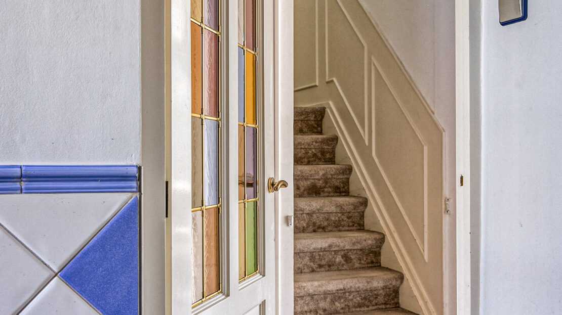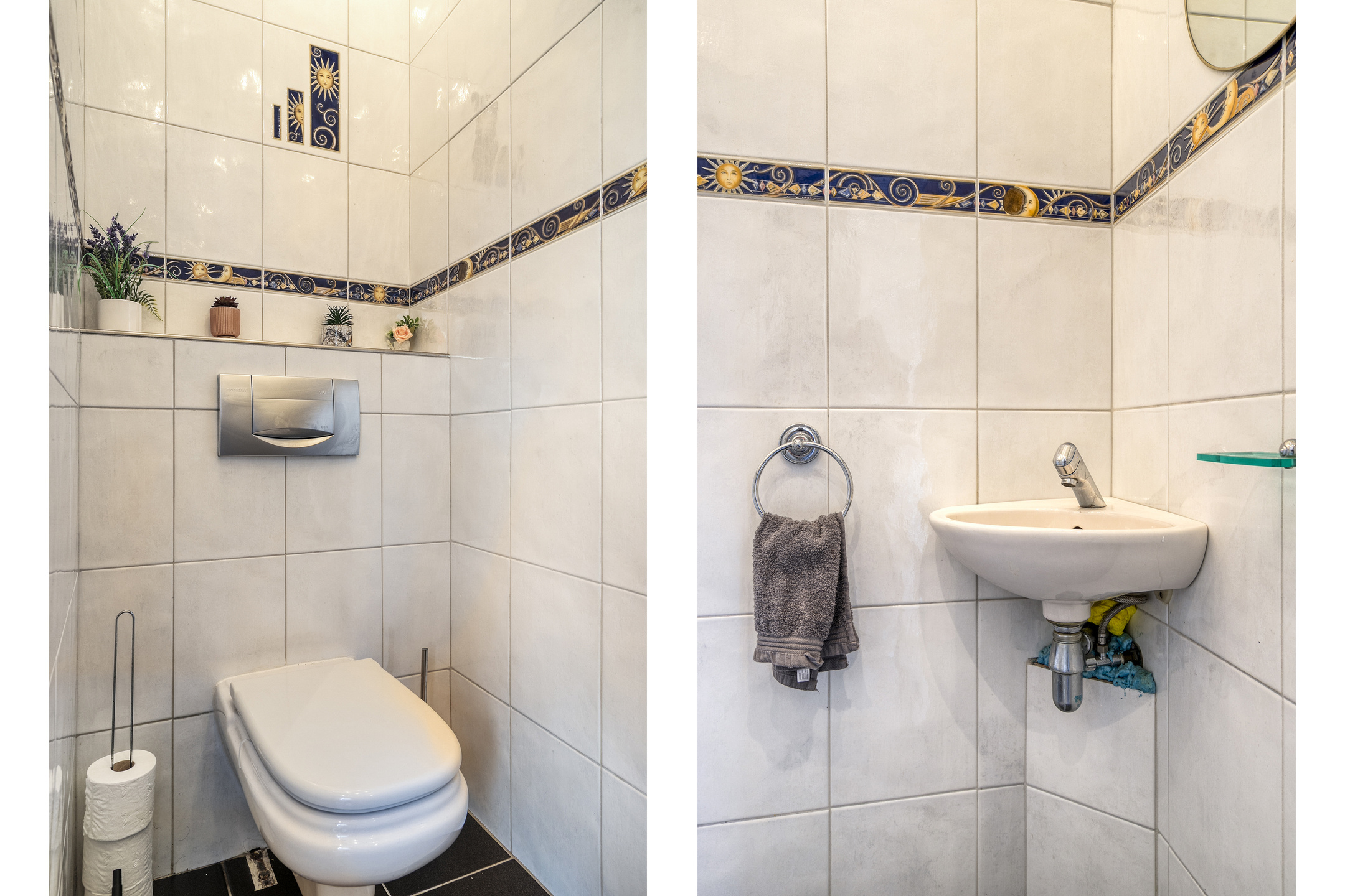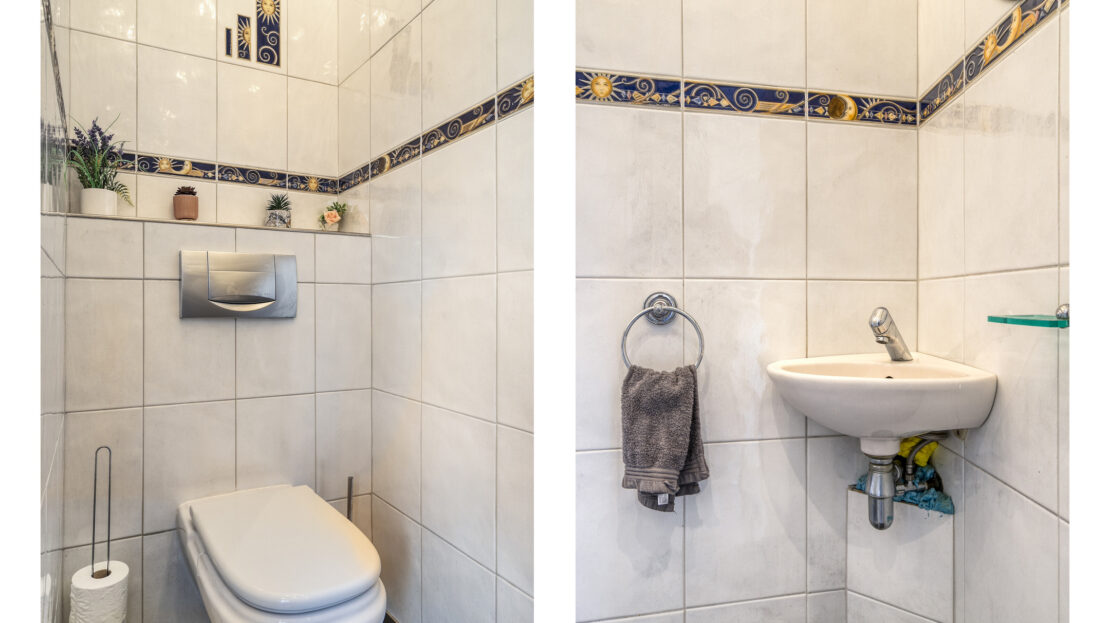 Via de betegelde voortuin bereikt u de entree van de woning. De hal biedt toegang tot het volledig betegelde toilet, voorzien van een hangcloset en fonteintje, de meterkast en de keuken.