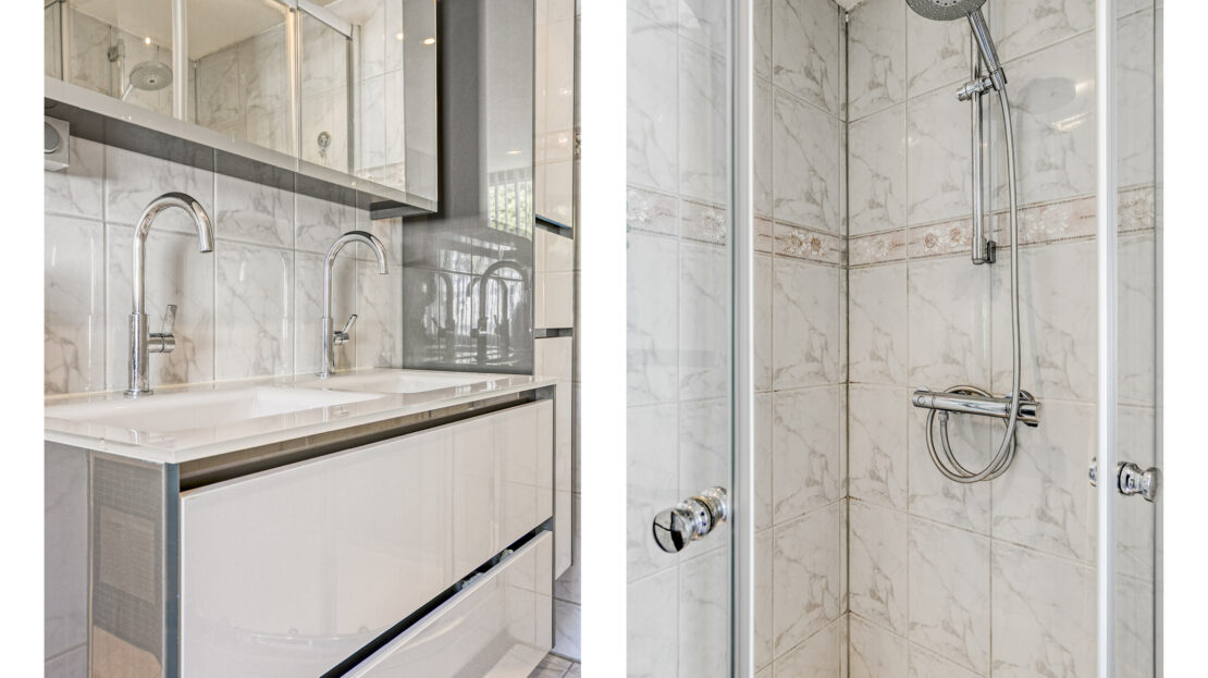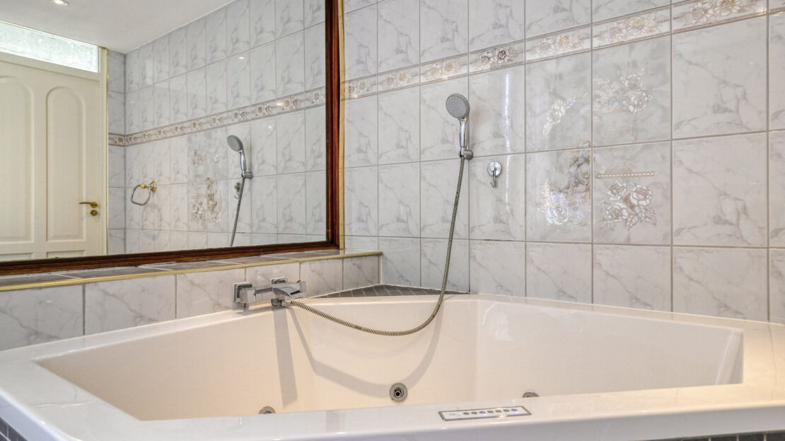 De royale badkamer is uitgerust met een hoekligbad, een douchecabine, een wastafelmeubel met bijpassende kast, een tweede toilet (hangcloset) en een designradiator.