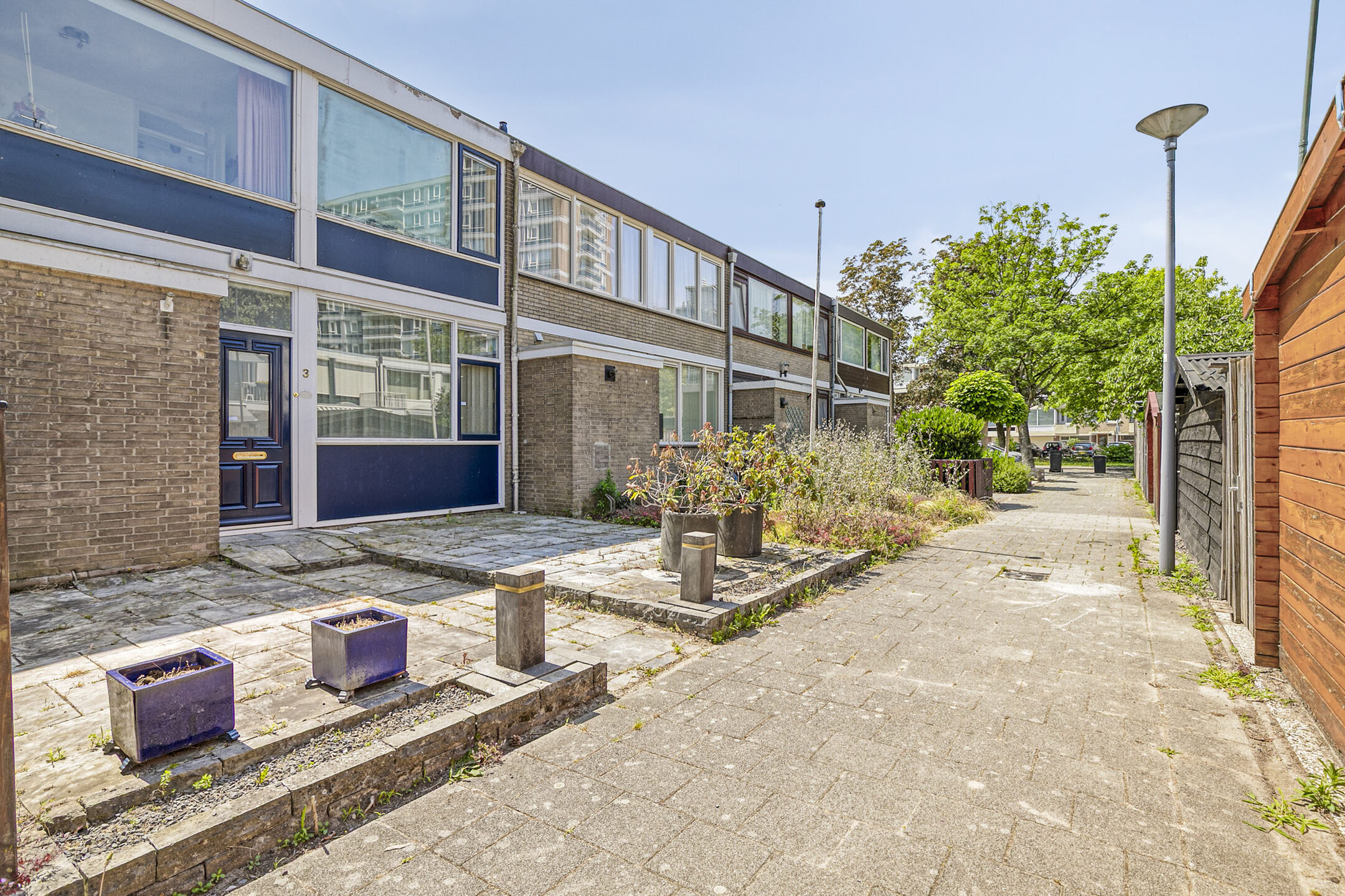 Twee slaapkamers bevinden zich aan de achterzijde van de woning en zijn beide voorzien van zonwering, ideaal voor het reguleren van licht en temperatuur. De derde slaapkamer ligt aan de voorzijde.